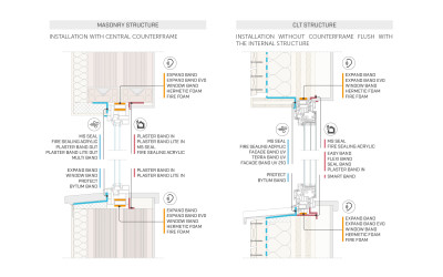 EXPAND BAND self-expanding tape by Rothoblaas ensures long-lasting, permanent elastic expansion, providing protection against water, dust and wind. WINDOW BAND offers a triple function: it seals door and window joints against air and heavy rain while maintaining thermal-acoustic performance across the full depth. It is the self-expanding tape for door and window frames: a single product capable of sealing all three levels.