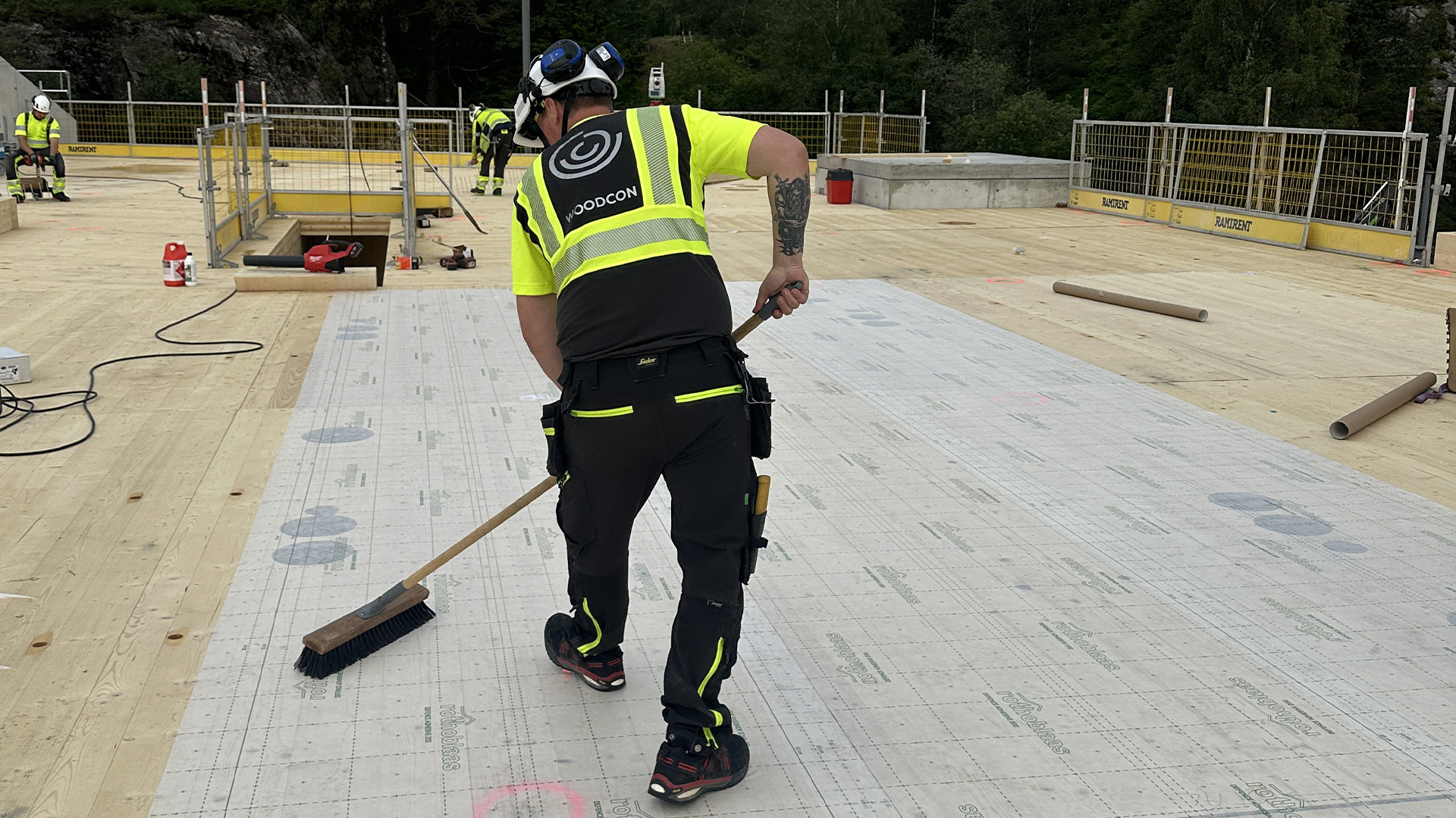 To prevent rain and seepage from damaging the wooden surface, WOODCON AS protected floors on the construction site with Rothoblaas DEFENCE ADHESIVE self-adhesive membrane.