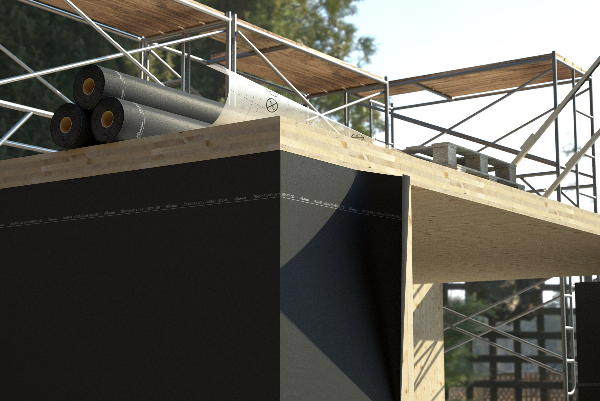 The adhesive surface prevents the formation of airflow behind the membrane in case of accidental breakage or failure to seal. The membrane's fully self-adhesive surface allows fast and secure installation: it is suitable for factory pre-installation and protects CLT elements during transport and on site.