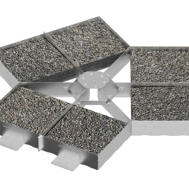 The fall protection system is designed for flat roofs with inclines up to 5° with PVC or bituminous material final covering, with or without gravel. Effective with standard-sized concrete ballast sheets, it can be installed on flat roofs and withstands any plane stress (360°).