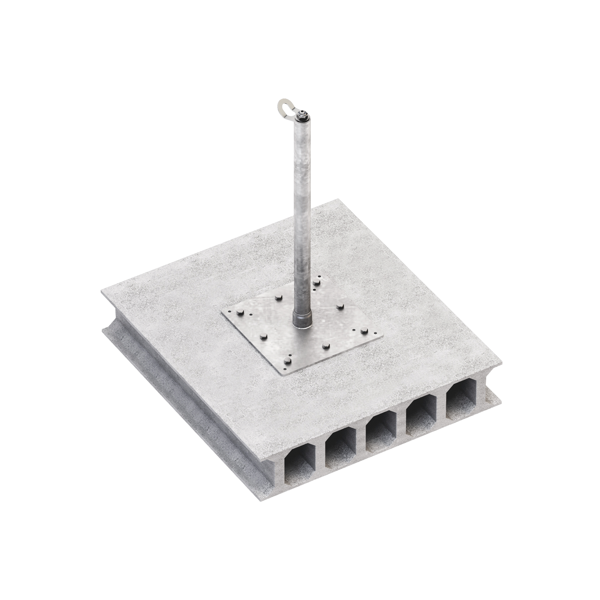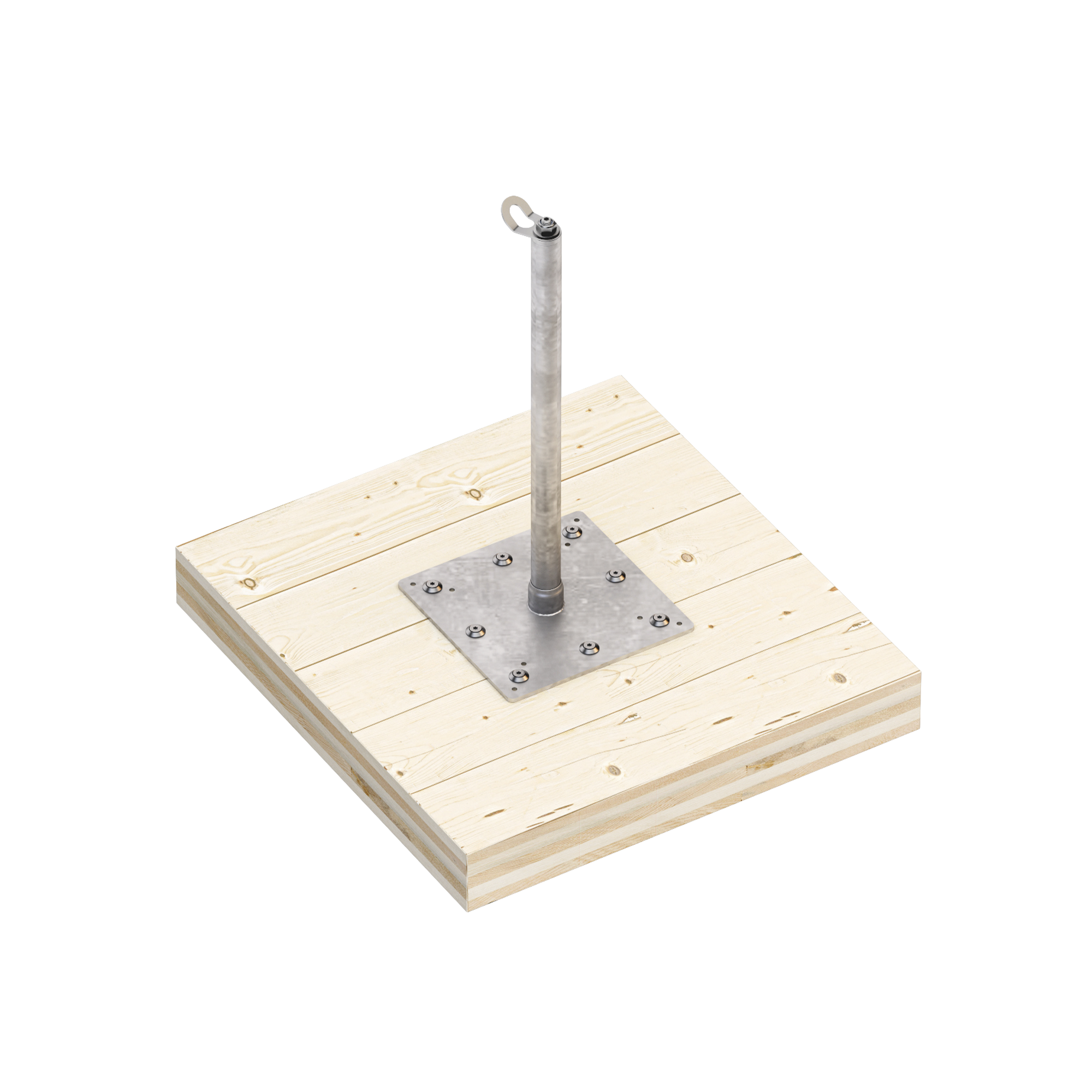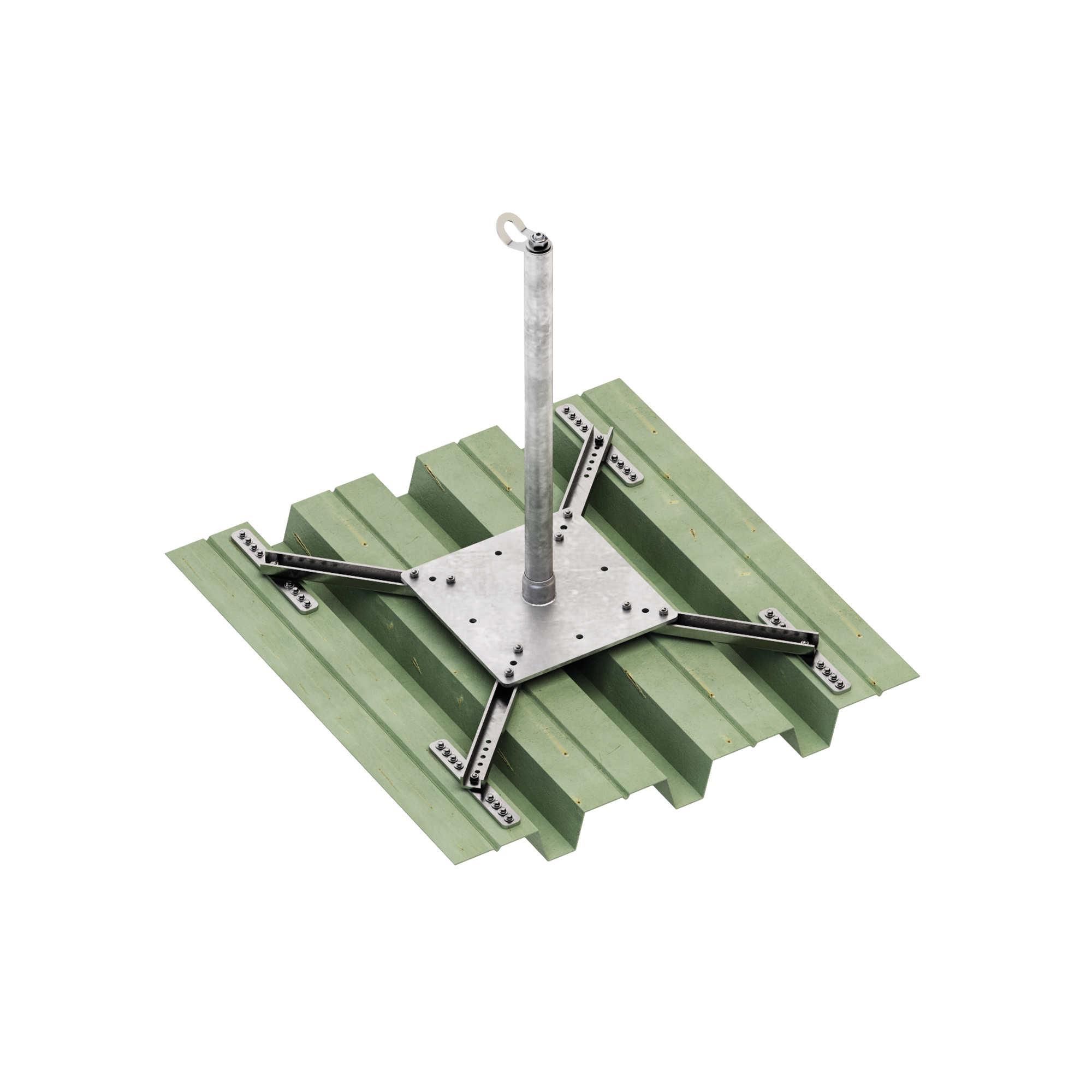 The TOWER XL support with increased base plate in combination with the AOS01 eyelet creates an anchor point for roofing operations. The enlarged bottom plate makes it possible to distribute the actions arising from the anchoring devices over a larger area.