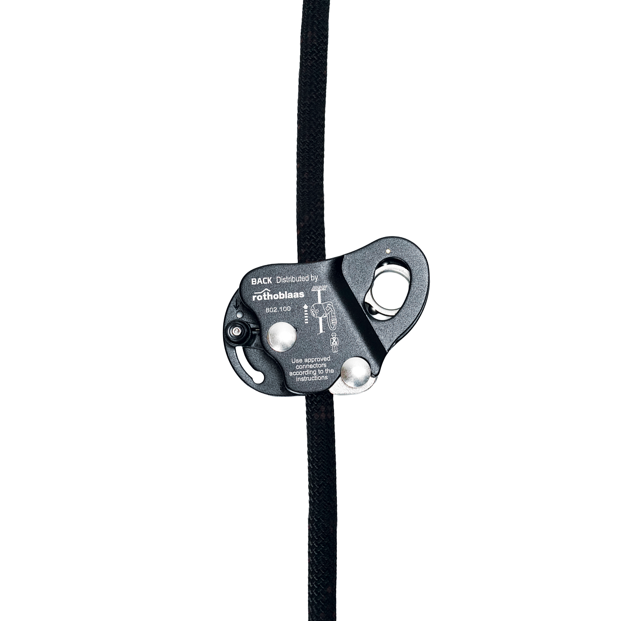 Device made of stainless steel and aluminium alloy. Includes steel carabiner with autoblock ring nut. With special button for switching between fall arrest and positioning modes.