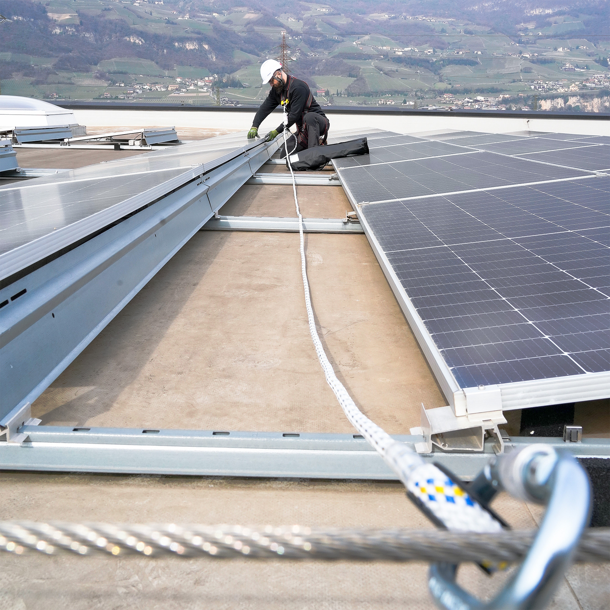 ROOF BASE is the fall protection kit suitable for all standard roofing work equipment and includes the IRIS fall protection harness, LINOSTOP the 10 metre long rope with adjustable guided device, the helmet for workplace safety, on industry and construction POP and the FAST LINK "D" link.