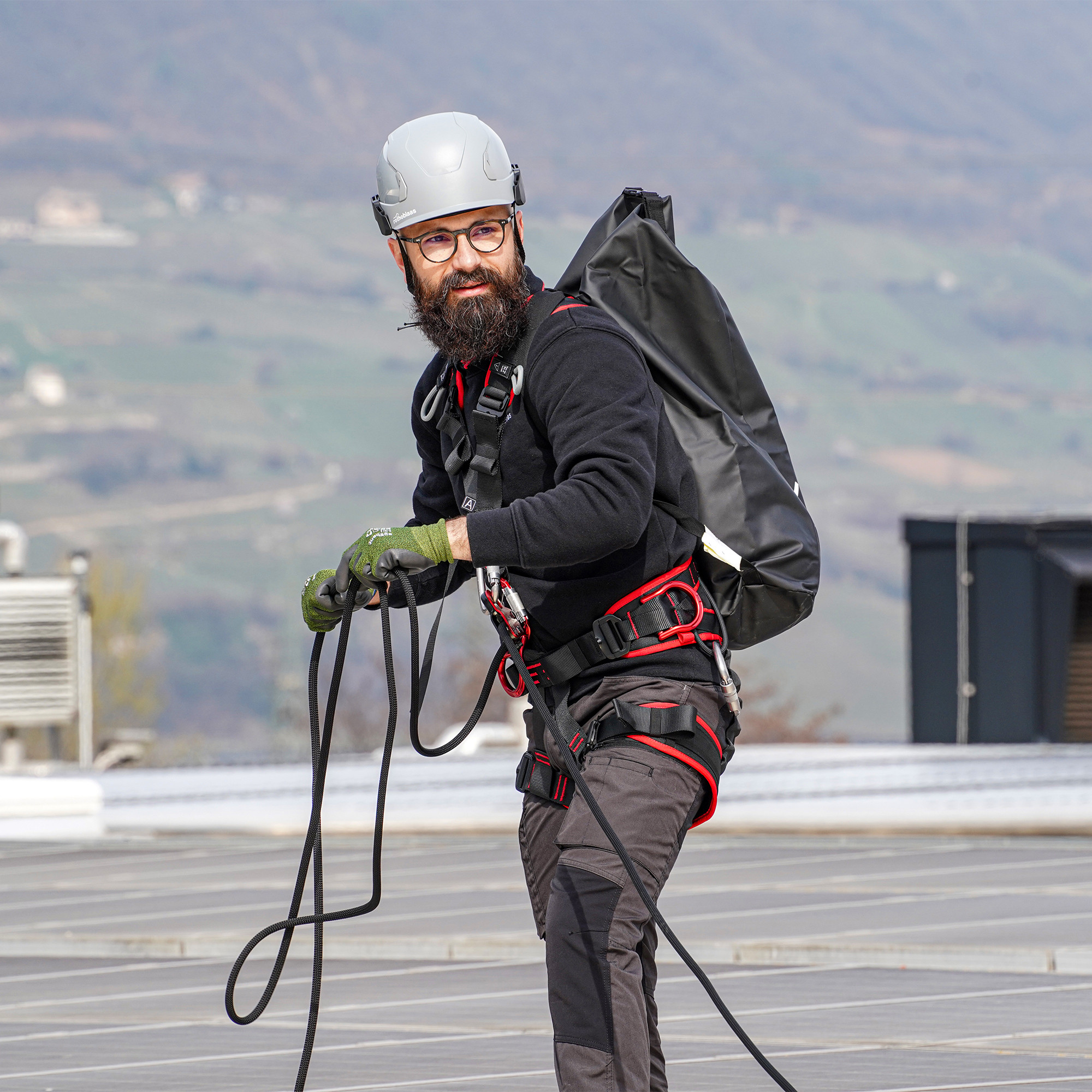 ROOF PRO is the professional fall protection kit for work on roofs that includes the complete SPARTA fall protection and positioning harness, ROPE1 semi-static rope with self-locking carabiner, 15 metres long, and the BACK removable guided fall protection device.
