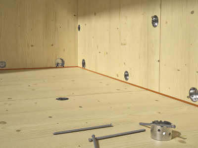 The version with screws (RING60T) is perfectly suited for connections between CLT panels as a floor-to-floor, floor-to-wall or wall-to-wall joint system. Pre-Installable in factory or on site, it allows positioning the panels according to any inclination and tolerances.