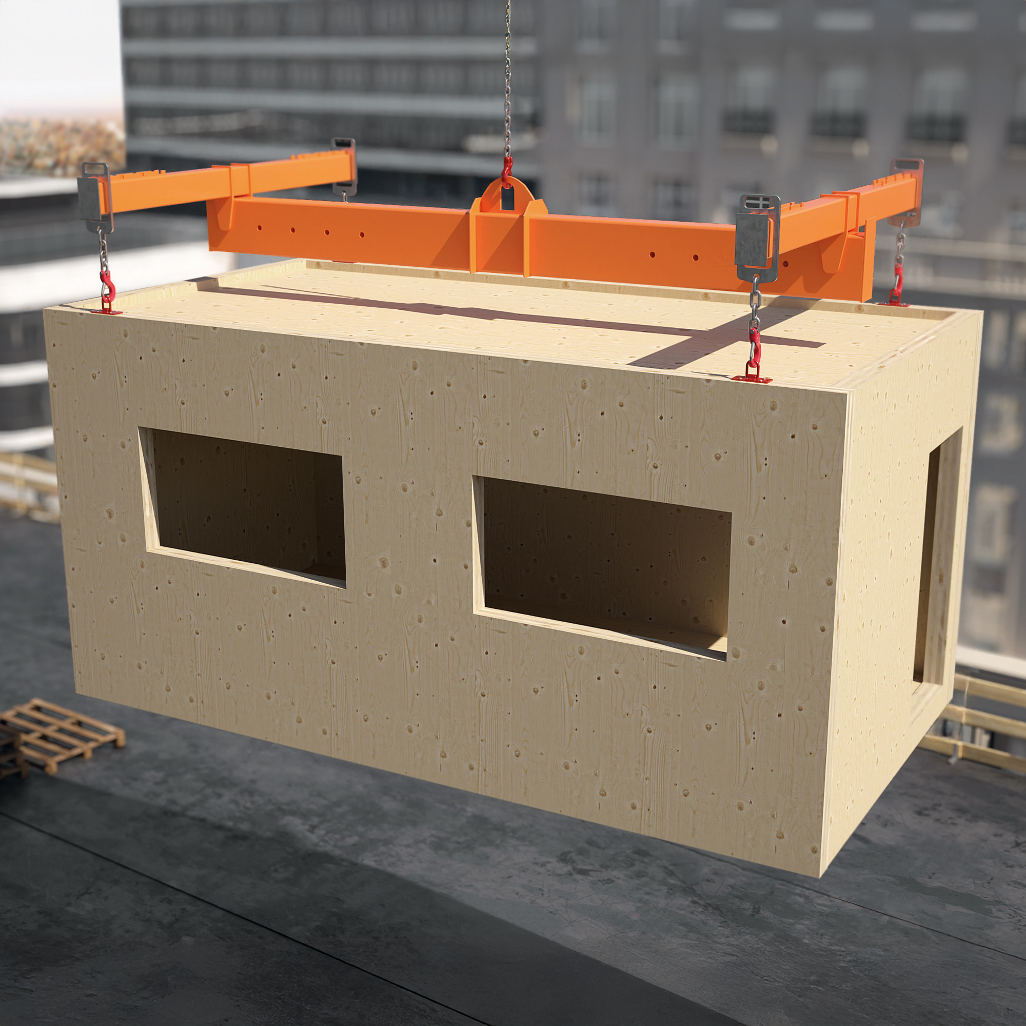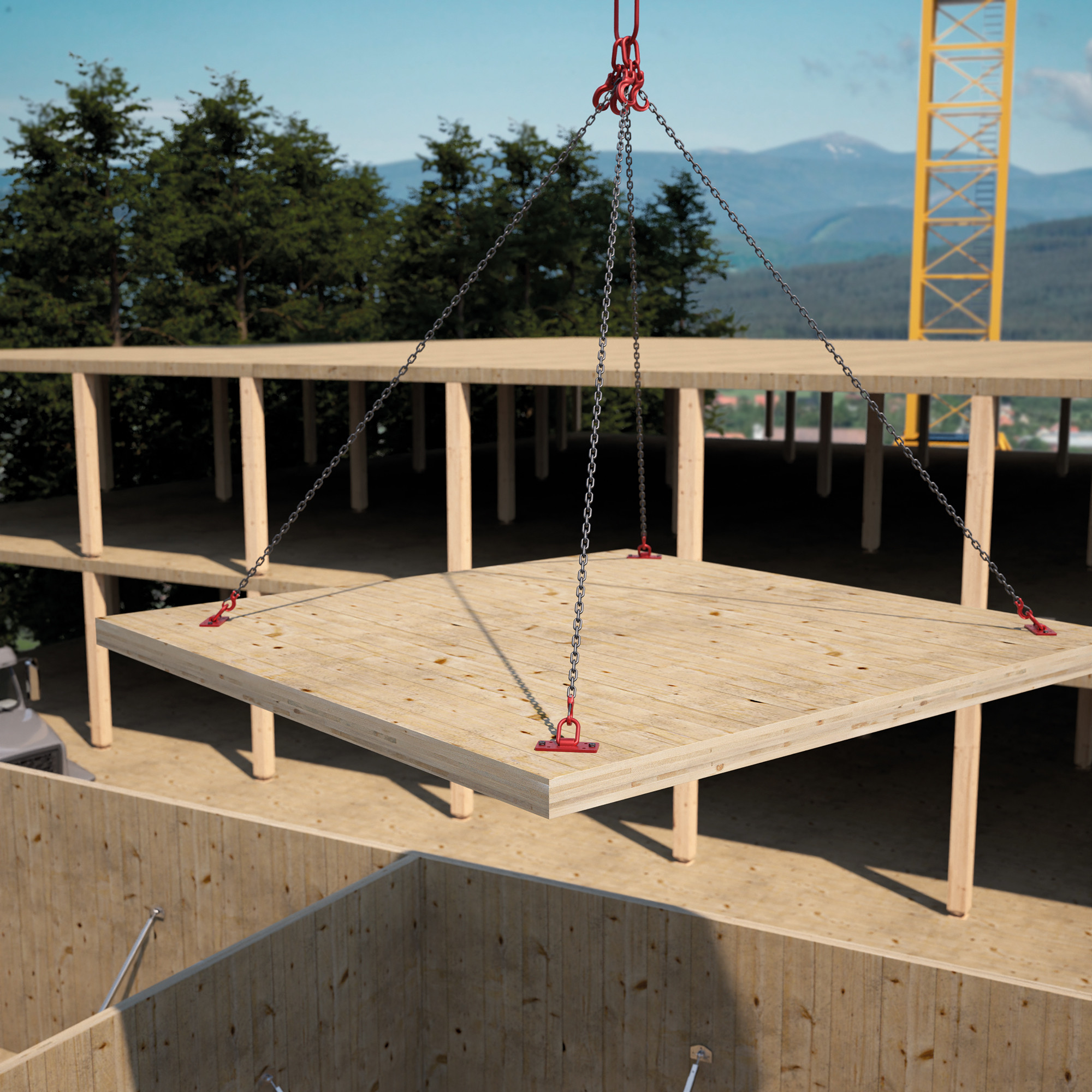 One product – two functions. The plate can be used either as a lifting device to transport timber elements, or as a temporary fall protection anchor point.