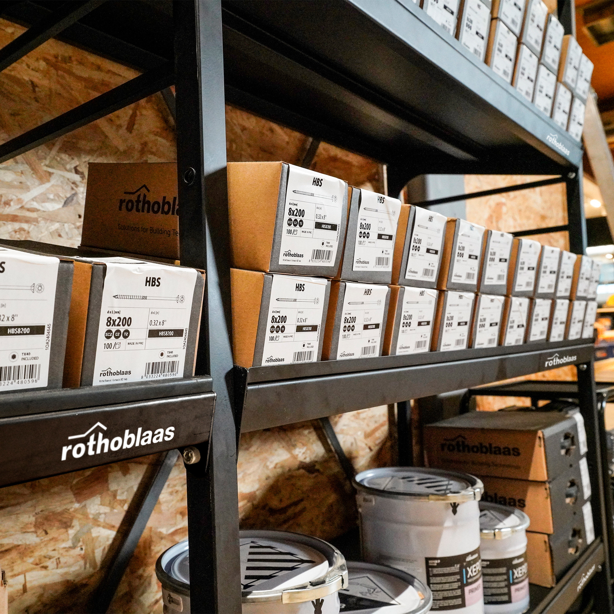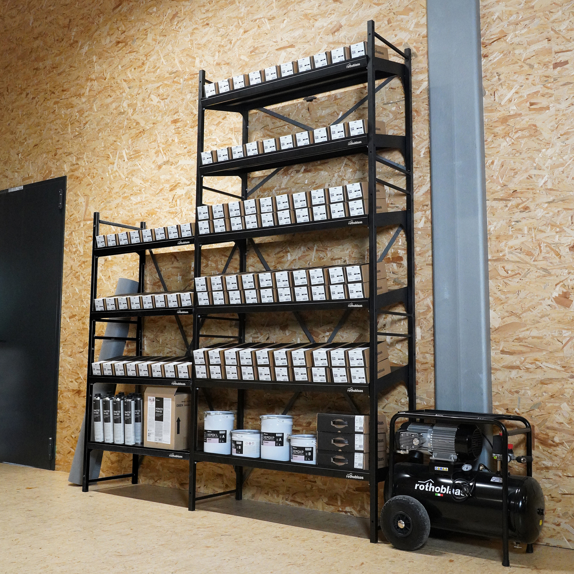 Wide and stable shelves, ideal for organising and storing boxes of screws and other materials.
