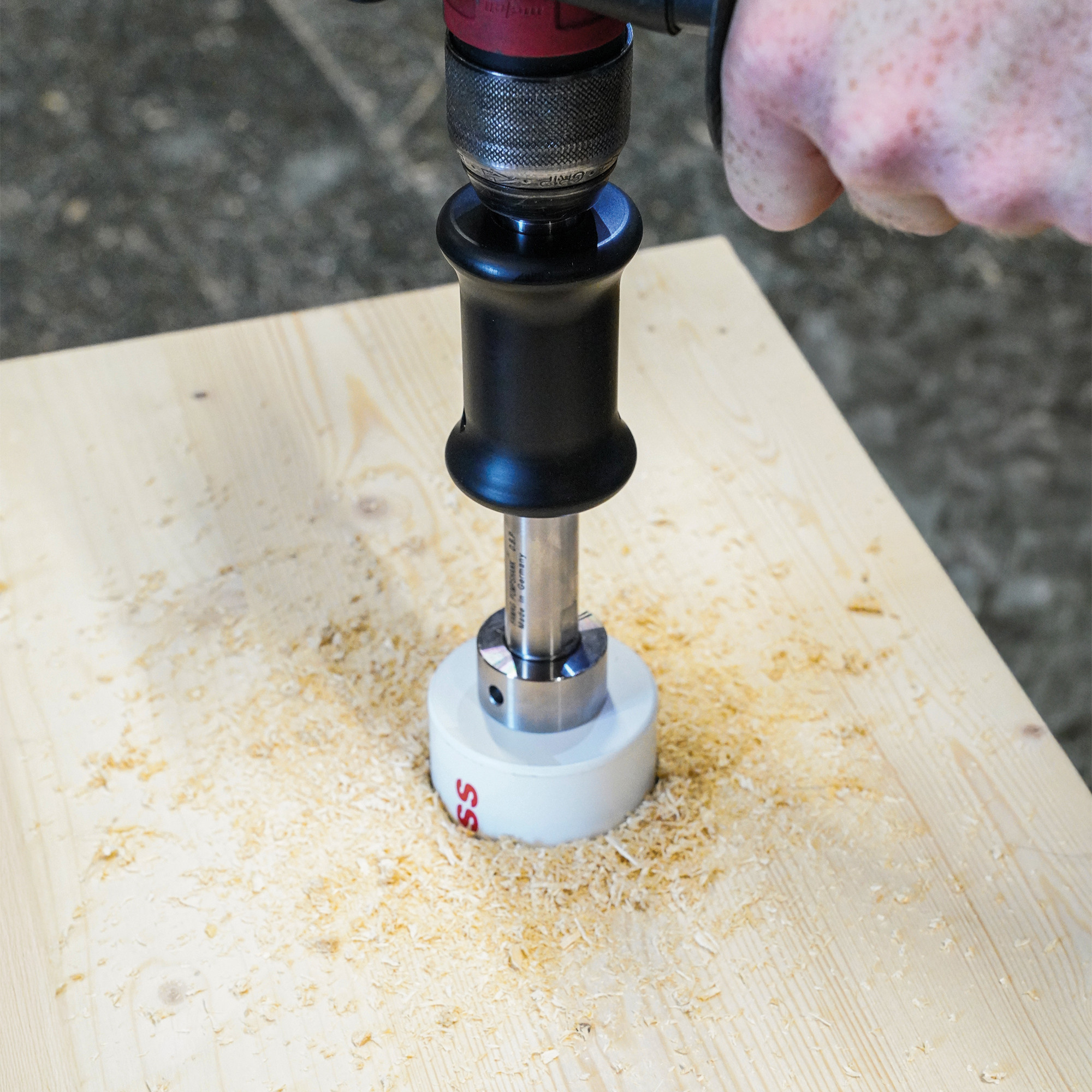 Rapid core ejection via the safety handle during drilling with hole saws.
