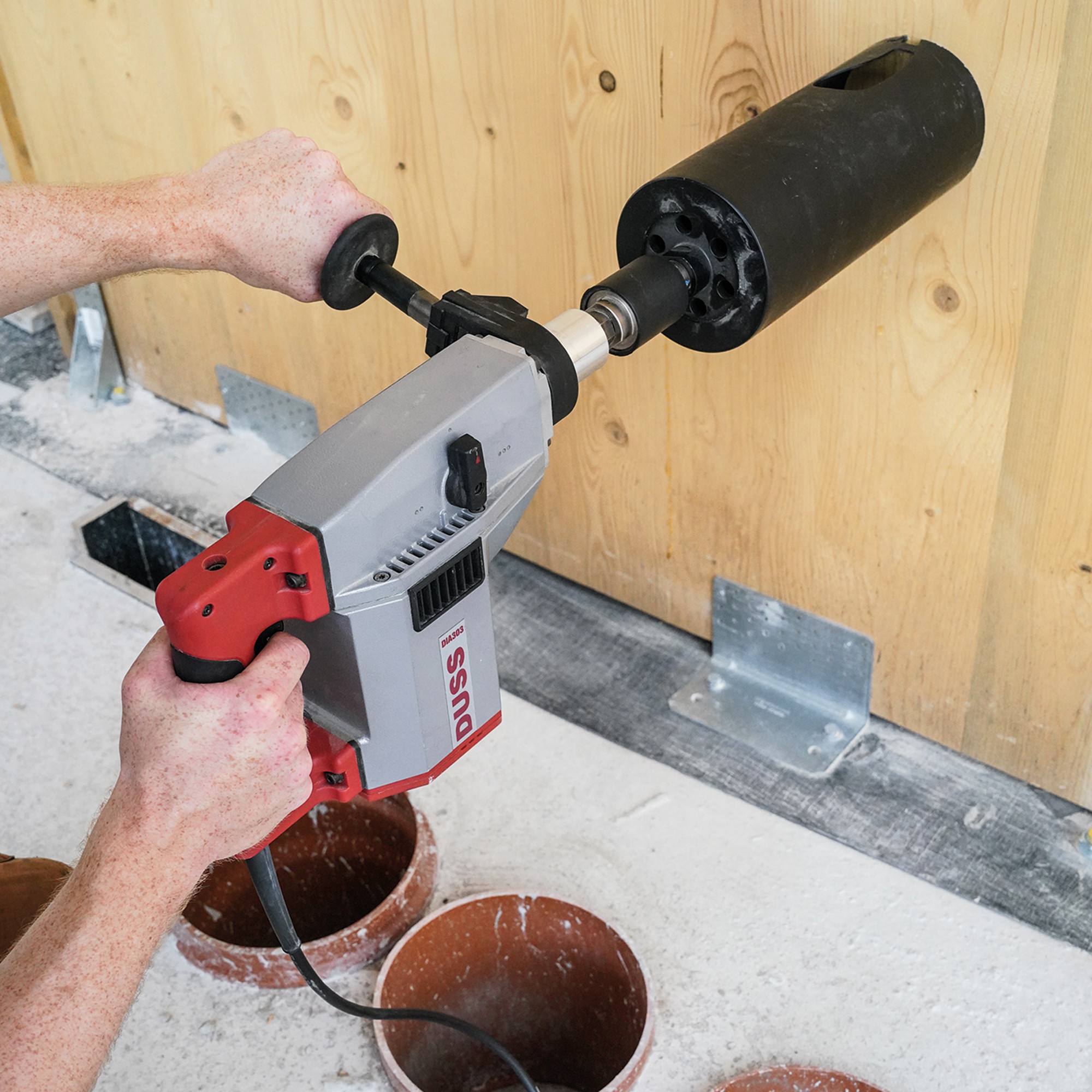 The DUSS DIA 303 dry drill for drilling and perforations features a drilling range from Ø40 to 322 mm, regardless of whether it is used freehand or on a support. Drilling performance is excellent, especially when working on medium and large-sized holes.
