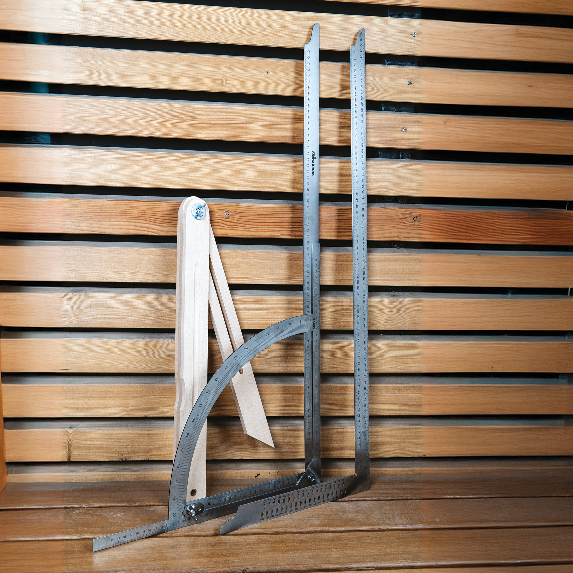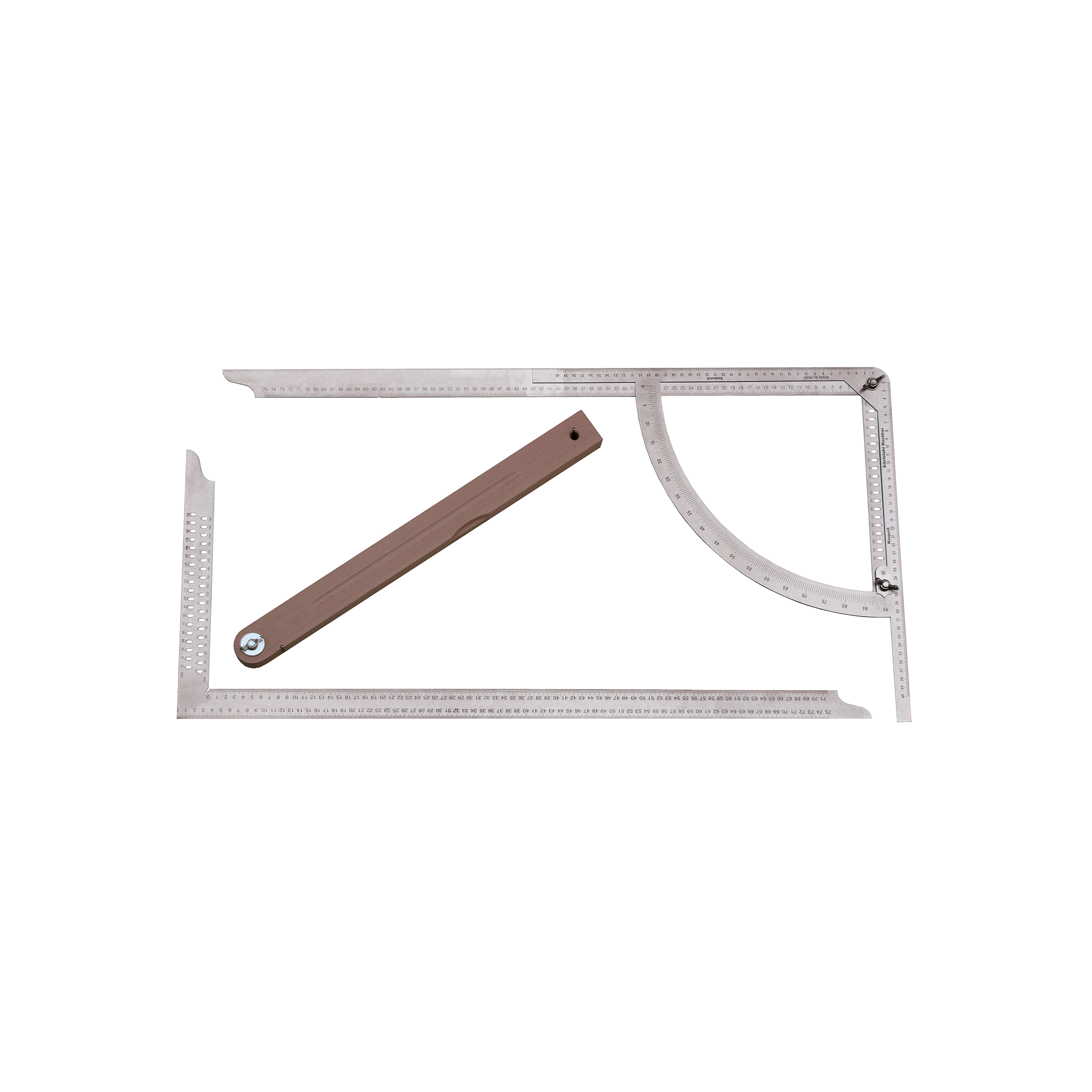 Three classic marking tools in one set: carpenter’s square, rafter square and sliding T bevel.